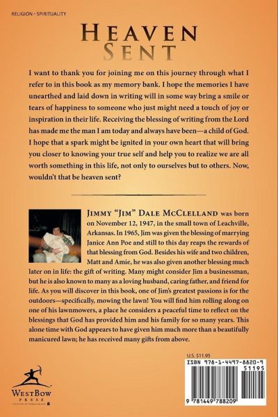 I want to thank you for joining me on this journey through what I refer to in this book as my memory bank. I hope the memories I have unearthed and laid down in writing will in some way bring a smile or tears of happiness to someone who just might need a touch of joy or inspiration in their life. Receiving the blessing of writing from the Lord has made me the man I am today and always have been-a child of God. I hope that a spark might be ignited in your own heart that will bring you closer to knowing your true self and help you to realize we are all worth something in this life, not only to ourselves but to others. Now, wouldn't that be heaven sent?