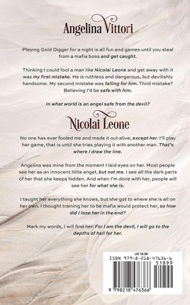 Angelina Vittori Playing Gold Digger for a night is all fun and games until you steal from a mafia boss and get caught. Thinking I could fool a man like Nicolai Leone and get away with it was my first mistake. He is ruthless and dangerous, but devilishly handsome. My second mistake was falling for him. Third mistake? Believing I'd be safe with him. In what world is an angel safe from the devil? Nicolai Leone No one has ever fooled me and made it out alive, except her. I'll play her game, that is until she tries playing it with another man. That's where I draw the line. Angelina was mine from the moment I laid eyes on her. Most people see her as an innocent little angel, but not me. I see all the dark parts of her that she keeps hidden. And when I'm done with her, people will see her for what she is. I taught her everything she knows, but she got to where she is all on her own. I thought training her to be mafia would protect her, so how did I lose her in the end? Mark my words, I will find her. For I am the devil, I will go to the depths of hell for her.