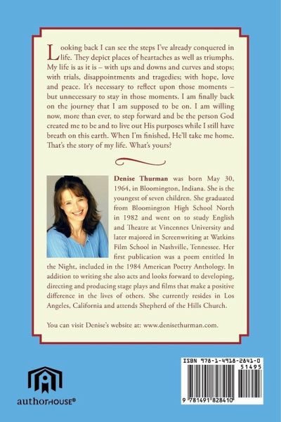 Looking back I can see the steps I've already conquered in life. They depict places of heartaches as well as triumphs. My life is as it is - with ups and downs and curves and stops; with trials, disappointments and tragedies; with hope, love and peace. It's necessary to reflect upon those moments - but unnecessary to stay in those moments. I am finally back on the journey that I am supposed to be on. I am willing now, more than ever, to step forward and be the person God created me to be and to live out His purposes while I still have breath on this earth. When I'm finished, He'll take me home. That's the story of my life. What's yours?