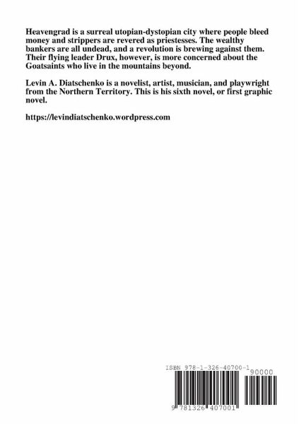 Heavengrad is a surreal utopian-dystopian city where people bleed money and strippers are revered as priestesses. The wealthy bankers are all undead, and a revolution is brewing against them. Their flying leader Drux, however, is more concerned about the Goatsaints who live in the mountains beyond. Levin A. Diatschenko is a novelist, artist, musician, and playwright from the Northern Territory. This is his sixth novel, or first graphic novel.