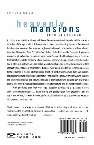 A classic of architectural history and theory, Heavenly Mansions interprets architecture as a reflection of the age in which it flowers, and traces the alternating themes of fantasy and functionalism as exemplified in various styles and in the works of a number of influential men, including Wren, Viollet-le-Duc, William Butterfield, and Le Corbusier. Succinctly summarizing 800 years of viewpoints about architecture, it ranges from Gothic architecture to the Renaissance to the influence of modern abstract art on twentieth-century architecture. "Each essay is a voyage of discovery. What is so interesting and what makes Mr. Summerson the architectural critic of his generation . . . is [an] aversion to dogma. . . . It is supremely well worth reading."-Spectator
