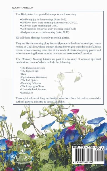 The Bible states five special blessings for each morning. God brings joy in the mornings (Psalm 30:5). God loves anew every morning (Lamentations 3:2223). God visits every morning (Job 7:18). God enables us for service every morning (Isaiah 50:4). God promises an eternal morning (Isaiah 21:12). We call these blessings heavenly morning glories. They are like the morning glory flowers (Ipomoea nil) whose heart-shaped leaves remind of Gods love, whose trumpet-shaped flowers give muted sound of Christs return, whose covering vines hint of the reach of Christs forgiving power, and whose unraveling flowers promise newness and color to Gods creation. The Heavenly Morning Glories are part of a treasury of unusual spiritual meditations, some of which include the following: The Banqueting House The Unlived Life Baca Opportunistic Witnessing The Full Quiver Doubting Believers The Language of Tears I Love the Lord, Because . . . Euroclydon These spiritually enriching meditations were born from thirty-five years of the authors pastoral ministry to several churches.