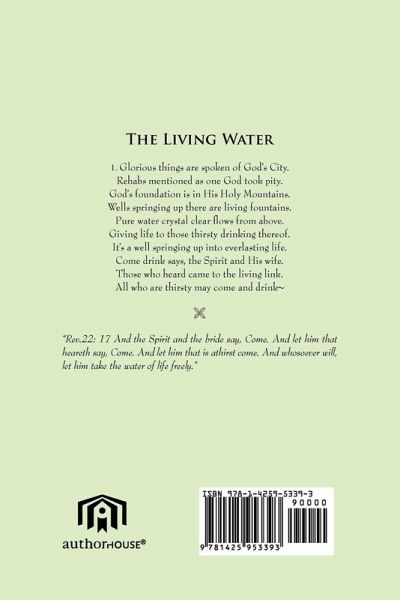 The Living Water 1. Glorious things are spoken of God's City. Rehabs mentioned as one God took pity. God's foundation is in His Holy Mountains.Wells springing up there are living fountains. Pure water crystal clear flows from above.Giving life to those thirsty drinking thereof.It's a well springing up into everlasting life. Come drink says, the Spirit and His wife.Those who heard came to the living link.All who are thirsty may come and drink~ "Rev.22: 17 And the Spirit and the bride say, Come. And let him that heareth say, Come. And let him that is athirst come. And whosoever will, let him take the water of life freely."