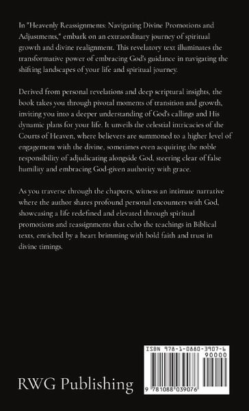 In "Heavenly Reassignments: Navigating Divine Promotions and Adjustments," embark on an extraordinary journey of spiritual growth and divine realignment. This revelatory text illuminates the transformative power of embracing God's guidance in navigating the shifting landscapes of your life and spiritual journey. Derived from personal revelations and deep scriptural insights, the book takes you through pivotal moments of transition and growth, inviting you into a deeper understanding of God's callings and His dynamic plans for your life. It unveils the celestial intricacies of the Courts of Heaven, where believers are summoned to a higher level of engagement with the divine, sometimes even acquiring the noble responsibility of adjudicating alongside God, steering clear of false humility and embracing God-given authority with grace. As you traverse through the chapters, witness an intimate narrative where the author shares profound personal encounters with God, showcasing a life redefined and elevated through spiritual promotions and reassignments that echo the teachings in Biblical texts, enriched by a heart brimming with bold faith and trust in divine timings. With a keen focus on the transformation from a Courts of Heaven Reporter to a Courts of Heaven Prophet, the reader is given a firsthand account of the profound spiritual warfare, the dynamics of heavenly counsel meetings, and the weighty yet glorious role of being a prophet working closely with God. These personal narratives breathe life into the age-old scriptures, offering a vivid lens to view and understand them in contemporary times. Discover a God who is intimately involved in every aspect of your journey, constantly orchestrating movements that are aligned with a grandiose plan for your life. The narrative reassures that God's timing is perfect, urging believers to foster patience as they evolve in their paths, and encouraging them to forge ahead with bold faith, to live a life rich with purpose and aligned with God's grand design. Dive deep into a reservoir of spiritual wisdom as you witness the process of stepping into roles of higher spiritual authority, understanding that what might seem like a demotion in earthly realms could indeed be a heavenly promotion. Learn the vitality of aligning oneself with God's word as you make judgments and decrees in the heavenly courts, serving as a beacon of justice and righteousness. "Heavenly Reassignments: Navigating Divine Promotions and Adjustments" calls believers to ready themselves for their divine missions, encouraging them to steep themselves in prayer, to anticipate spiritual dreams and revelations as part of a higher call, and to remain vigilant as they discern the strategies of the enemy. In this spiritually enriching journey, find solace in the revelations that God's plans are unfolding with a promise of double repayment, bringing new hope and lighting the path for those braving spiritual battles. Grounded firmly on Biblical scriptures, it is a compelling read, offering a rich tapestry of spiritual insights, heavenly realities, and encouraging prophetic revelations to bolster your faith and guide your spiritual path to a higher plane of divine assignments.