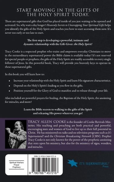 Start moving in the gifts of the Holy Spirit today. There are supernatural gifts that God has placed inside of you just waiting to be opened and activated. So, why wait a day longer? Heavenly Secrets to Unwrapping Your Spiritual Gifts helps you identify the gifts of the Holy Spirit and teaches you how to start accessing them now. It's never too early or too late to start. The first step is developing a powerful, intimate and dynamic relationship with the Gift-Giver: the Holy Spirit! Tracy Cooke is a respected prophet who trains and empowers everyday Christians to move in the extraordinary supernatural power the Bible claims is available today! It's not reserved for special people or prophets; the gifts of the Holy Spirit are readily accessible to every single follower of Jesus. In this powerful book, Tracy will provide you heavenly keys to operate in these supernatural gifts. In this book you will learn how to: Increase your relationship with the Holy Spirit and learn His signature characteristics. Depend on the Holy's Spirit's leading as you flow in the gifts. Position yourself for the Glory of God to manifest and to release through your life. Also included are powerful prayers for healing, the Baptism of the Holy Spirit, the anointing for miracles, and more! Learn the Bible secrets to walking in the gifts of the Spirit and releasing His power wherever you go!