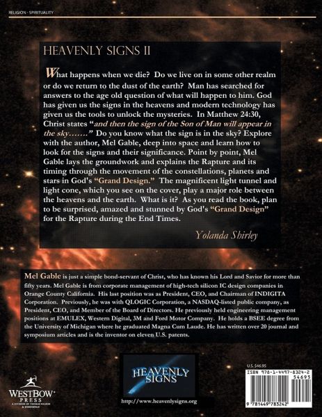 What happens when we die? Do we live on in some other realm or do we return to the dust of the earth? Man has searched for answers to the age old question of what will happen to him. God has given us the signs in the heavens and modern technology has given us the tools to unlock the mysteries. In Matthew 24:30, Christ states "and then the sign of the Son of Man will appear in the sky……." Do you know what the sign is in the sky? Explore with the author, Mel Gable, deep into space and learn how to look for the signs and their significance. Point by point, Mel Gable lays the groundwork and explains the Rapture and its timing through the movement of the constellations, planets and stars in God's "Grand Design." The magnificent light tunnel and light cone, which you see on the cover, play a major role between the heavens and the earth. What is it? As you read the book, plan to be surprised, amazed and stunned by God's "Grand Design" for the Rapture during the End Times.