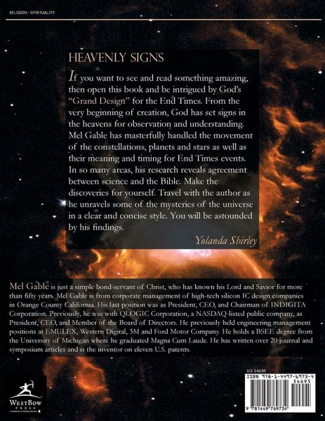 Heavenly Signs If you want to see and read something amazing, then open this book and be intrigued by God's "Grand Design" for the End Times. From the very beginning of creation, God has set signs in the heavens for observation and understanding. Mel Gable has masterfully handled the movement of the constellations, planets and stars as well as their meaning and timing for End Times events. In so many areas, his research reveals agreement between science and the Bible. Make the discoveries for yourself. Travel with the author as he unravels some of the mysteries of the universe in a clear and concise style. You will be astounded by his findings. Yolanda Shirley