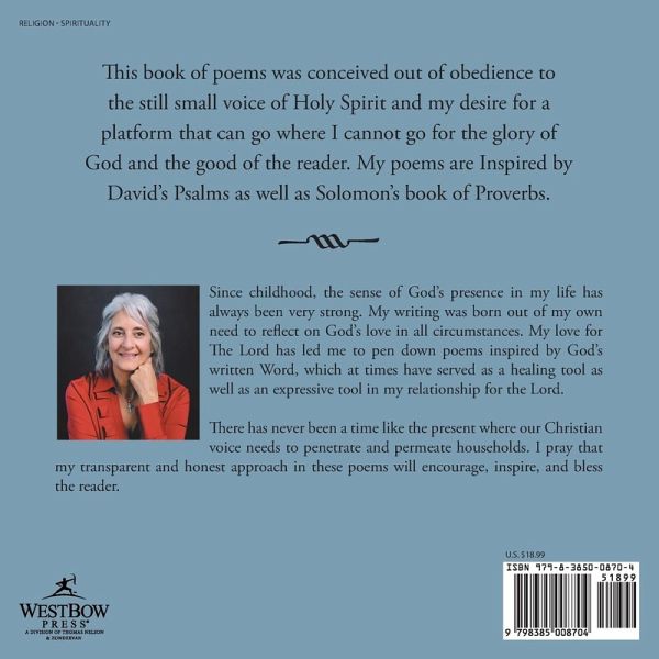 This book of poems was conceived out of obedience to the still small voice of Holy Spirit and my desire for a platform that can go where I cannot go for the glory of God and the good of the reader. My poems are Inspired by David's Psalms as well as Solomon's book of Proverbs.