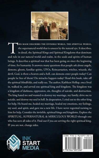This book describes the invisible world, the spiritual world, the supernatural world that is unseen by the natural eye. It describes, in detail, the Spiritual Kings and Spiritual Kingdoms that dominate and rule in our natural world and realm, in the souls and spirits of human beings. It describes a spiritual war that has been going on since the beginning of time, for humanity. It answers many questions that people ask about angels, demons, ghosts, familiar spirits, UFOs, Reincarnation, witches, wizards, the devil, God, is there a heaven and a hell, can demons enter people today? Can people be free of them? Do miracles happen today? Read this book, take o the spiritual blindfolds, and really see. e author, Kathleen Hollop, once lived in, walked in, and served one spiritual king and kingdom. e kingdom was a kingdom of darkness, oppression, sin, thoughts of suicide, and destruction. e king hated me and wanted to destroy my marriage, my family, drive me to suicide, and destroy my soul in hell. In desperation, I cried out to the other king for help. He heard me, healed my marriage, healed my emotions, my feelings, my soul, and spirit, and gave me a new life. I have never regretted turning to him for help. Consider the invisible, spiritual kings and kingdoms. Explore the SPIRITUAL, SUPERNATURAL & MIRICULOUS WORLD through one who has seen all sides of it. Find out if you are serving the right spiritual king. IF you are not, change sides.