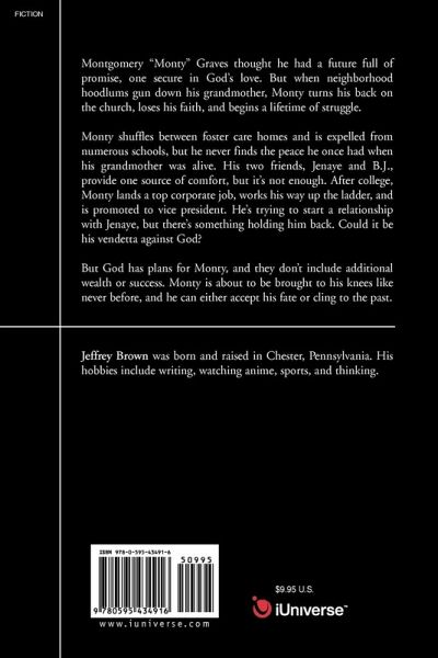 Montgomery "Monty" Graves thought he had a future full of promise, one secure in God's love. But when neighborhood hoodlums gun down his grandmother, Monty turns his back on the church, loses his faith, and begins a lifetime of struggle. Monty shuffles between foster care homes and is expelled from numerous schools, but he never finds the peace he once had when his grandmother was alive. His two friends, Jenaye and B.J., provide one source of comfort, but it's not enough. After college, Monty lands a top corporate job, works his way up the ladder, and is promoted to vice president. He's trying to start a relationship with Jenaye, but there's something holding him back. Could it be his vendetta against God? But God has plans for Monty, and they don't include additional wealth or success. Monty is about to be brought to his knees like never before, and he can either accept his fate or cling to the past.