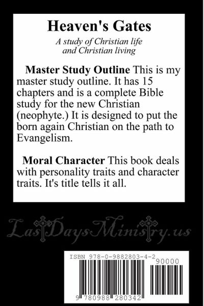 A study of Christian life and Christian living. Master Study Outline This is my master study outline. It has 15 chapters and is a complete Bible study for the new Christian (neophyte.) It is designed to put the born again Christian on the path to Evangelism. Moral Character This book deals with personality traits and character traits. It's title tells it all.