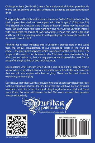 Love's text is, "When Christ who is our life shall appear, then shall we also appear with Him in glory," (Col. 3:4). Why should the Christian have a hope of heaven? What may be expected there? What is Christ's role there right now and how will the Christian interact with Him before the throne of God? What does it mean that Christ is glorious, and how will his appearing usher in with great glory the heavenly state for all those who trust in him? Nothing has greater influence into a Christian's practice here in this world than the serious consideration of our everlasting estate in the world to come; the glory and happiness which is prepared for the elect in Christ. This work is not a scan or facsimile, has been carefully transcribed by hand being made easy to read in modern English, and has an active table of contents for electronic versions.