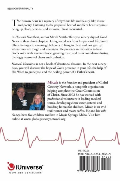 The human heart is a wonderful mystery of rhythmic life and beauty, like music and poetry. Listening to the beat of another's heart requires being up close, personal and intimate. Trust is essential. In Heaven's Heartbeat, author Micah Smith presents a ninety-day devotional dedicated to helping you hear God's heartbeat. Using anecdotes from his personal life, Micah offers messages to encourage you to hang in there and not give up when times are tough and uncertain. He presents an invitation to hear God's voice with renewed hope, growing trust, and calm confidence during the foggy seasons of chaos and confusion. Heaven's Heartbeat is not a book of devotional theories. In the next ninety-days you will discover the reality of God's presence in your life, the help of his Word to guide you, and the healing power of a Father's heart.