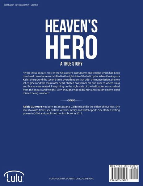 "In the initial impact, most of the helicopter's instruments and weight, which had been overhead, came loose and shifted to the right side of the helicopter. When the Augusta K2 hit the ground the second time, everything on that side- the transmission, the two jet engines and the main rotor head- shifted away from me and over to where Craig and Mario were seated. Everything on the right side of the helicopter was crushed from the impact and weight. Even though I was badly hurt and couldn't move, I had missed being crushed." Abbie Guerrero was born in Santa Maria, California and is the oldest of four kids. She loves to write, travel, spend time with her family, and watch sports. She started writing poems in 2006 and published her first book in 2015.