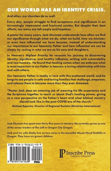 Our world has an identity crisis. And often, our churches do as well. Every day, people struggle to find acceptance and significance in an increasingly impersonal and fractured society. But despite their best efforts, too many are left empty and hopeless. A pastor for many years, Jack Shumate understands how often we find our significance through what we do, what we build, how we minister; or even how influential we have become, instead of understanding our importance to our heavenly Father and how influential we can be simply by resting in who we are as his sons and daughters. In Heaven's Highest Priority he recounts his journey to discovering identity, significance, and healthy influence, writing with vulnerability and raw honesty. He found that healing comes when we embrace what is most important to our Father in heaven: a loving relationship with him and with others. Our heavenly Father is madly in love with this orphaned world, and he longs to see people in safe and loving families that challenge, empower, and release them to become more than they ever dreamed. "Pastor Jack does an amazing job of weaving his life experience and the Scriptures together to teach us about God's healing power, giving us a new perspective on the Father's heart and what biblical ministry should look like in the post-COVID era of the church." Michael Esposito Director of Regional Reclaim Ministries International