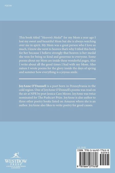 This book titled "Heaven's Medal" for my Mom a year ago I lost my sweet and beautiful Mom but she is always watching over me in spirit. My Mom was a great person who I love so much, I know she went to heaven that's why I titled this book for her because I believe strongly that heaven is her medal she won for being so kind and generous to everyone. Some poems about my Mom are inside these wonderful pages, Also I write about all the good times I had with my Mom. Also nature I wrote poems for the glory inside the days of spring and summer how everything is a joyous smile.
