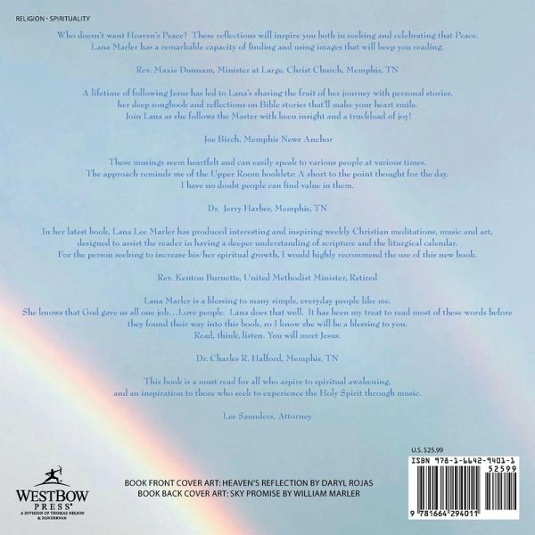 Who doesn't want Heaven's Peace? These reflections will inspire you both in seeking and celebrating that Peace. Lana Marler has a remarkable capacity of finding and using images that will keep you reading. Rev. Maxie Dunnam, Minister at Large, Christ Church, Memphis, TN A lifetime of following Jesus has led to Lana's sharing the fruit of her journey with personal stories, her deep songbook and reflections on Bible stories that'll make your heart smile. Join Lana as she follows the Master with keen insight and a truckload of joy! Joe Birch, Memphis News Anchor These musings seem heartfelt and can easily speak to various people at various times. The approach reminds me of the Upper Room booklets: A short to the point thought for the day. I have no doubt people can find value in them. Dr. Jerry Harber, Memphis, TN In her latest book, Lana Lee Marler has produced interesting and inspiring weekly Christian meditations, music and art, designed to assist the reader in having a deeper understanding of scripture and the liturgical calendar. For the person seeking to increase his/her spiritual growth, I would highly recommend the use of this new book. Rev. Kenton Burnette, United Methodist Minister, Retired Lana Marler is a blessing to many simple, everyday people like me. She knows that God gave us all one job...Love people. Lana does that well. It has been my treat to read most of these words before they found their way into this book, so I know she will be a blessing to you. Read, think, listen. You will meet Jesus. Dr. Charles R. Halford, Memphis, TN This book is a must read for all who aspire to spiritual awakening, and an inspiration to those who seek to experience the Holy Spirit through music. Lee Saunders, Attorney