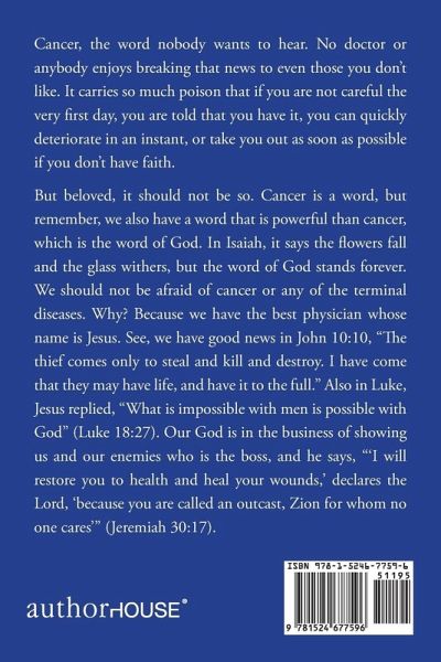 Cancer, the word nobody wants to hear. No doctor or anybody enjoys breaking that news to even those you don’t like. It carries so much poison that if you are not careful the very first day, you are told that you have it, you can quickly deteriorate in an instant, or take you out as soon as possible if you don’t have faith. But beloved, it should not be so. Cancer is a word, but remember, we also have a word that is powerful than cancer, which is the word of God. In Isaiah, it says the flowers fall and the glass withers, but the word of God stands forever. We should not be afraid of cancer or any of the terminal diseases. Why? Because we have the best physician whose name is Jesus. See, we have good news in John 10:10, "The thief comes only to steal and kill and destroy. I have come that they may have life, and have it to the full." Also in Luke, Jesus replied, "What is impossible with men is possible with God" (Luke 18:27). Our God is in the business of showing us and our enemies who is the boss, and he says, "‘I will restore you to health and heal your wounds,’ declares the Lord, ‘because you are called an outcast, Zion for whom no one cares’" (Jeremiah 30:17).