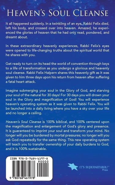 Heaven's Soul Cleanse It all happened suddenly. In a twinkling of an eye. Rabbi Felix died, left his body, and crossed over into heaven. Amazed, he experienced the glories of heaven that he had only read, pondered, and dreamt about. In these extraordinary heavenly experiences, Rabbi Felix's eyes were opened to life-changing truths about the spiritual world that he shares with you.Get ready to turn on its head the world of convention through keys to a life of transformation as you undergo a glorious and heavenly soul cleanse. Rabbi Felix Halpern shares this heavenly gift as it was given to him three days upon his return from heaven after suffering a fatal heart attack.Imagine submerging your soul in the Glory of God, and starving your soul of the natural for 30 days! For 30 days you will drown your soul in the Glory and magnification of God! You will experience heaven's operating system as it was given to Rabbi Felix. You will be launched into a daily living where you have a sky over your life and no longer a ceiling. Heaven's Soul Cleanse is 100% biblical, and 100% centered upon the magnification and enlargement of God's glory and presence. It is guaranteed to imprint your soul and transform your mind. No longer will you be burdened by mortal pressures; no longer will you ask God repeatedly for the same thing. This new operating system will teach you to transfer ownership of your daily burdens to God, and it is 100% sustainable.