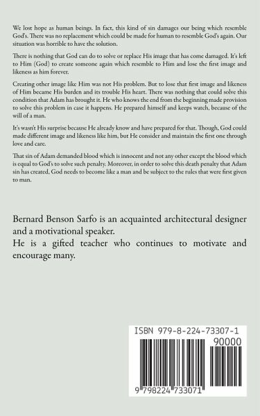 We lost hope as human beings. In fact, this kind of sin damages our being which resemble God's. There was no replacement which could be made for human to resemble God's again. Our situation was horrible to have the solution. There is nothing that God can do to solve or replace His image that has come damaged. It's left to Him (God) to create someone again which resemble to Him and lose the first image and likeness as him forever. Creating other image like Him was not His problem. But to lose that first image and likeness of Him became His burden and its trouble His heart. There was nothing that could solve this condition that Adam has brought it. He who knows the end from the beginning made provision to solve this problem in case it happens. He prepared himself and keeps watch, because of the will of a man. It's wasn't His surprise because He already know and have prepared for that. Though, God could made different image and likeness like him, but He consider and maintain the first one through love and care. That sin of Adam demanded blood which is innocent and not any other except the blood which is equal to God's to solve such penalty. Moreover, in order to solve this death penalty that Adam sin has created, God needs to become like a man and be subject to the rules that were first given to man.