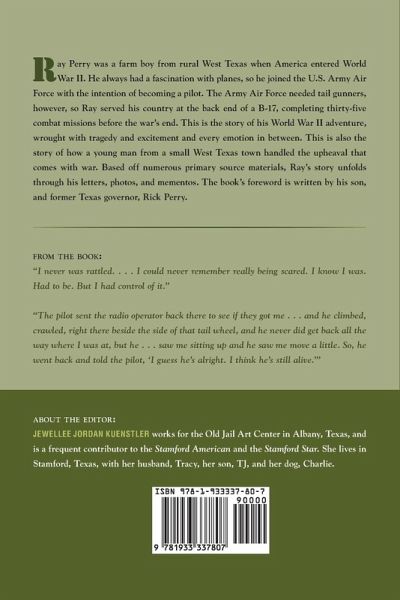 Ray Perry was a farm boy from rural West Texas when America entered World War II. He always had a fascination with planes, so he joined the U.S. Army Air Corps with the intention of becoming a pilot. The Army Air Corps needed tail gunners, however, so Ray served his country at the back end of a B-17, completing thirty-five combat missions before the war’s end. This is the story of his World War II adventure, wrought with tragedy and excitement and every emotion in between. This is also the story of how a young man from a small West Texas town handled the upheaval that comes with war. Based off numerous primary source materials, Ray’s story unfolds through his letters, photos, and mementos. The book’s foreword is written by his son, and former Texas governor, Rick Perry. "I never was rattled . . . . I could never remember really being scared. I know I was. Had to be. But I had control of it." "The pilot sent the radio operator back there to see if they got me . . . and he climbed, crawled, right there beside the side of that tail wheel, and he never did get back all the way where I was at, but he . . . saw me sitting up and he saw me move a little. So, he went back and told the pilot, ‘I guess he’s alright. I think he’s still alive.’"—Ray Perry, from the book