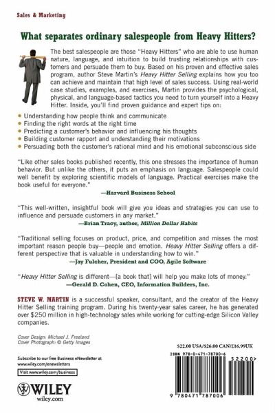The best salespeople are those "Heavy Hitters" who are able to use human nature, language, and intuition to build trusting relationships with customers and persuade them to buy. Based on his proven and effective sales program, author Steve Martin's Heavy Hitter Selling explains how you too can achieve and maintain that high level of sales success. Using real-world case studies, examples, and exercises, Martin provides the psychological, physical, and language-based tactics you need to turn yourself into a Heavy Hitter. Inside, you'll find proven guidance and expert tips on: