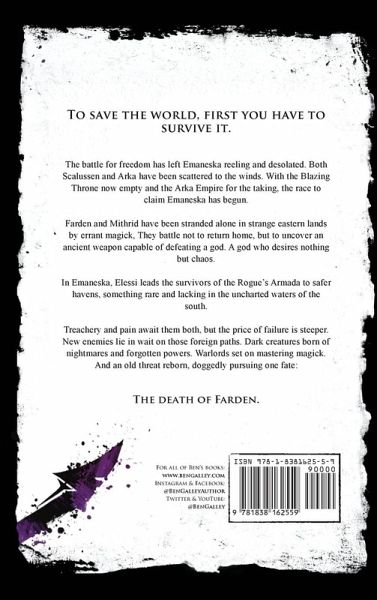 To save the world, first you have to survive it. The battle for freedom has left Emaneska reeling and desolated. Both Scalussen and Arka are scattered to the winds. With the Blazing Throne now empty and the Arka Empire for the taking, the race to claim Emaneska has begun. Farden and Mithrid have been stranded alone in strange eastern lands by errant magick, They battle not to return home, but to uncover an ancient weapon capable of defeating a god. A god who desires nothing but chaos. In Emaneska, the survivors of the Rogue's Armada search for safer havens, something rare and lacking in the uncharted waters of the south. Treachery and pain await them both, but the price of failure is steeper. New enemies lie in wait on those foreign paths. Dark creatures born of nightmares and forgotten powers. Warlords set on mastering magick. And an old threat reborn, doggedly pursuing one fate: The death of Farden. "Absolutely loved it. Epic fantasy with a contemporary twist, characters that you feel for or love to hate, and a cool nordic-inspired world... Sharp prose and a storyteller's touch." - John Gwynne "Emotional characterization, jaw-dropping magic, world-building so vivid that it makes you feel as if this place tangibly exists." - Out Of This World Reviews "Ben Galley is one of the best voices in the dark fantasy genre." - Fantasy Faction "Ben is an author who has breathed new life into epic fantasy. If you haven't read these books yet, you really, really need to rectify that." - Bookworm Blues "An epic page-turner at its finest." - Amazon