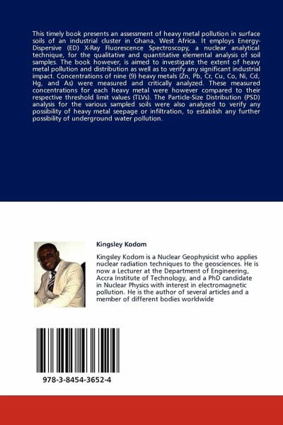 This timely book presents an assessment of heavy metal pollution in surface soils of an industrial cluster in Ghana, West Africa. It employs Energy-Dispersive (ED) X-Ray Fluorescence Spectroscopy, a nuclear analytical technique, for the qualitative and quantitative elemental analysis of soil samples. The book however, is aimed to investigate the extent of heavy metal pollution and distribution as well as to verify any significant industrial impact. Concentrations of nine (9) heavy metals (Zn, Pb, Cr, Cu, Co, Ni, Cd, Hg, and As) were measured and critically analyzed. These measured concentrations for each heavy metal were however compared to their respective threshold limit values (TLVs). The Particle-Size Distribution (PSD) analysis for the various sampled soils were also analyzed to verify any possibility of heavy metal seepage or infiltration, to establish any further possibility of underground water pollution.
