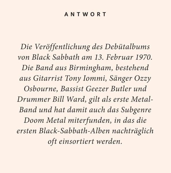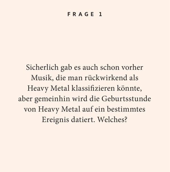 Wacken, harte Riffs und lange Haare: Doch Heavy Metal ist mehr! Was haben "Herr der Ringe" und Heavy Metal gemeinsam? Wer singt Hits wie "Kaugummi ist mega!" oder "Pommesgabel"? Welche Band veröffentlichte als einzige DDR-Band eine vollständige Metal-LP? Und ist das nur schrecklicher Lärm oder doch die schönste Musik der Welt? Seit über 50 Jahren polarisiert der Heavy Metal Musikfans auf der ganzen Welt, doch kaum ein anderes Genre bietet so viel Abwechslung.Stilvoll, elegant und immer eine gute Idee: Die Reihe "Quiz im Quadrat" präsentiert sich in modernem Design und sorgt für unterhaltsamen Rätselspaß - verpackt in einer edlen Geschenkbox. Perfekt als besondere 'Grußkarte' mit Mehrwert - zum Verschenken oder Selberfreuen!