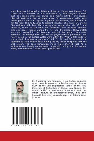 Yonki Reservoir is located in Kainantu district of Papua New Guinea. Fish species in the reservoir are now threatened by anthropogenic activities such as ongoing small-scale alluvial gold mining activities and sewage disposal practices in the catchment areas. Fish contaminated with heavy metals pose a threat to aquatic organisms and humans, who depend on fish for food. This study aimed to assess the levels of chromium (Cr), arsenic (As), cadmium (Cd), lead (Pb), mercury (Hg), copper (Cu), zinc (Zn), and nickel (Ni) in the surface water and sediments from the Yonki Reservoir area and upper streams during the wet and dry seasons. Heavy metals were also assessed in the tissues of selected fish species from Yonki Reservoir. The findings revealed that the physiochemical parameters and heavy metals in the surface water were within the WHO (2011) limits for the survival of aquatic organisms. Cr, Cd, Cu, Ni, and Pb exceeded the sediment quality guideline levels during the dry season compared with the wet season. The geo-accumulation index values showed that Pb in sediments was heavily contaminated, especially during the dry season. Finally, recommended a Waste Management plan.