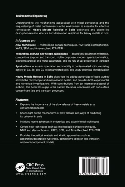 Understanding the mechanisms associated with metal complexes and the sequestering metal contaminants in the environment is essential for effective remediation. Heavy Metal Release in Soils describes and quantifies desorption/release kinetics and dissolution reactions in the release of heavy metals from soil. The book focuses on: New techniques - microscopic surface techniques, NMR and electrophoresis, XAFS, SFM, and time-resolved ATR-FTIR Theoretical analysis and kinetic approaches - adsorption/desorption hysteresis, competitive sorption and transport, multi-component models, speciation kinetics, isotherms and soil and metal parameters, and the role of soil properties on transport Applications - arsenic speciation and mobility in contaminated soils, modeling activity of CD, Zn, and Cu in contaminated soils, and in situ chemical immobilization A timely addition to the literature, this book highlights the desorption/release mechanisms for the purpose of resolving remediation dilemmas in contaminated environments. It gives you the added advantage of case studies at both the microscopic and macroscopic scales, and provides both experimental and numerical investigations. With contributions from an international panel of authors, Heavy Metals Release in Soils fills a gap in the current literature concerned with subsurface contaminant fate and transport processes.