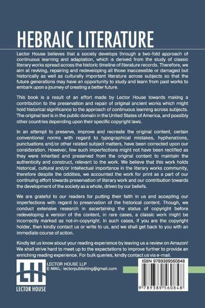 Hebraic Literature: Translations From The Talmud, Midrashim And Kabbala With Special Introduction By Maurice H. Harris, D.D. This book is a result of an effort made by us towards making a contribution to the preservation and repair of original classic literature. In an attempt to preserve, improve and recreate the original content, we have worked towards: 1. Type-setting & Reformatting: The complete work has been re-designed via professional layout, formatting and type-setting tools to re-create the same edition with rich typography, graphics, high quality images, and table elements, giving our readers the feel of holding a 'fresh and newly' reprinted and/or revised edition, as opposed to other scanned & printed (Optical Character Recognition - OCR) reproductions. 2. Correction of imperfections: As the work was re-created from the scratch, therefore, it was vetted to rectify certain conventional norms with regard to typographical mistakes, hyphenations, punctuations, blurred images, missing content/pages, and/or other related subject matters, upon our consideration. Every attempt was made to rectify the imperfections related to omitted constructs in the original edition via other references. However, a few of such imperfections which could not be rectified due to intentional\unintentional omission of content in the original edition, were inherited and preserved from the original work to maintain the authenticity and construct, relevant to the work. We believe that this work holds historical, cultural and/or intellectual importance in the literary works community, therefore despite the oddities, we accounted the work for print as a part of our continuing effort towards preservation of literary work and our contribution towards the development of the society as a whole, driven by our beliefs. We are grateful to our readers for putting their faith in us and accepting our imperfections with regard to preservation of the historical content. HAPPY READING!