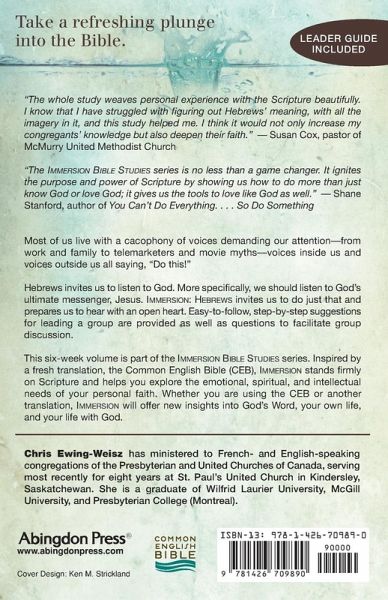 Most people live with a cacophony of voices demanding attention--from work and family to telemarketers and movie myths--voices inside and voices outside all saying, "Do this!" Hebrews invites each reader to listen to God. More specifically, everyone should listen to God's ultimate messenger, Jesus. Immersion: Hebrews invites readers to do just that and prepares them to hear with an open heart. Easy to follow, step-by-step suggestions for leading a group are provided as well as questions to facilitate group discussion. Immersion, inspired by a fresh translation--the Common English Bible--stands firmly on Scripture and helps readers explore the emotional, spiritual, and intellectual needs of their personal faith. More importantly, they'll be able to discover God's revelation through readings and reflections.