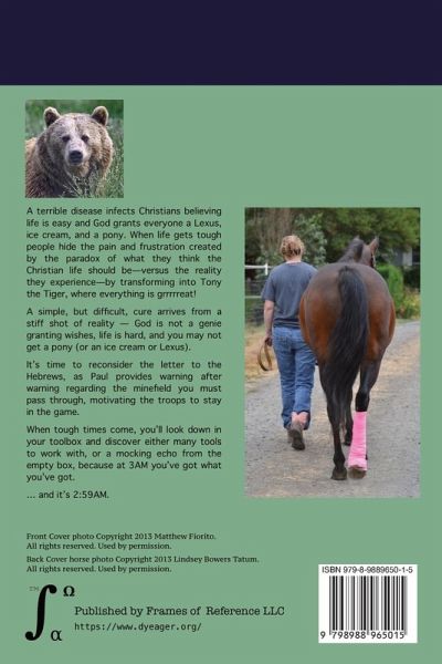 A terrible disease infects Christians from believing life is easy and God grants everyone a Lexus, ice cream, and a pony. When life gets tough people hide pain and frustration created by the paradox of what they think the Christian life should be-versus the reality they experience-by transforming into Tony the Tiger, where everything is grrrrreat! A simple, but difficult, cure arrives from a stiff shot of reality - God is not a genie granting wishes, life is hard, and you may not get a pony. It's time to take a good look at the letter to the Hebrews, as Paul provides warning after warning regarding the minefield you must navigate. Paul motivates the troops to not abandon what they know to be true and stay in the game, even when (not if) adversity strikes. When tough times come, you'll look down in your toolbox and discover either many tools to work with, or a mocking echo from the empty box, because at 3 AM you've got what you've got. ... and it's 2:59 AM.