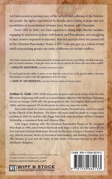 Art Gish records a moving story of the turmoil and suffering of the Palestinian people, the agony experienced by Israelis, and a vision of hope and new possibilities of reconciliation between Jews, Muslims, and Christians. From 1995 to 2001, Art Gish experiences living with Muslim families, engaging in nonviolent actions with Israelis and Palestinians, and struggling to find creative responses to injustice. Selected excerpts from his journal tell of the Christian Peacemaker Teams (CPT) work and give us a vision of how small peacemaking groups can make a difference in violent conflicts.