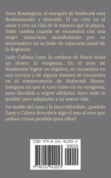 Zane Rossington, el marqués de Seabrook está desilusionado y aburrido. Él no cree en el amor y vive su vida de la manera que le plazca. Todo cambia cuando se encuentra con una mujer misteriosa deambulando por su invernadero en su baile de máscaras anual de la Regencia. Lady Callista Lyon, la condesa de Marín tenía un deseo: la venganza. En el acto de finalmente lograr su objetivo, se encuentra en una terraza y de alguna manera se encuentra en el conservatorio de Seabrook Manor. Insegura en que si tuvo éxito en su venganza, pero decidida a seguir adelante, hace todo lo posible para adaptarse a su nueva vida. En medio del caos y la incertidumbre, ¿podrán Zane y Calista descubrir algo el uno al otro que ambos creían perdido para ellos?