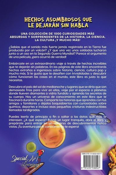 ¡Embárcate en un viaje extraordinario para descubrir muchos Hechos increíbles que te dejarán sin palabras! Este fascinante libro está lleno de hechos increíbles sobre ciencia, historia, cultura pop y mucho más, y es perfecto para mentes inquisitivas de todas las edades. Explora hechos sobre geografía, descubriendo los misterios de los lugares más apasionantes de nuestro planeta, desde la tierra del sol de medianoche hasta lugares que pensarías que son demasiado fríos para vivir. Viaja por el espacio entre planetas en los que llueven diamantes o vidrio fundido, aprende los secretos de tu cuerpo y las maravillas de la química. ¡Este libro será tu puerta de entrada a un universo de conocimiento! Comparte estas interesantes minicuentos con amigos y familiares: sorpréndeles contándoles muchos datos curiosos sobre deportes, describiendo extraños comportamientos animales e ingeniosos inventos. Puedes leerlo de principio a fin o detenerte en los hechos que más te fascinen: Datos asombrosos que te dejarán sin palabras te llevarán a un viaje lleno de aventuras y descubrimientos sorprendentes. Abre el libro y sumérjete en un mundo de hechos increíbles diseñado especialmente para mentes curiosas.