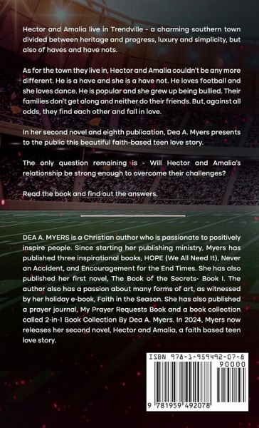 Hector and Amalia live in Trendville - a charming southern town divided between heritage and progress, luxury and simplicity, but also of haves and have nots. As for the town they live in, Hector and Amalia couldn't be any more different. He is a have and she is a have not. He loves football and she loves dance. He is popular and she grew up being bullied. Their families don't get along and neither do their friends. But, against all odds, they find each other and fall in love. In her second novel and eighth publication, Dea A. Myers presents to the public this beautiful faith-based teen love story. The only question remaining is - Will Hector and Amalia's relationship be strong enough to overcome their challenges? Read the book and find out the answers.