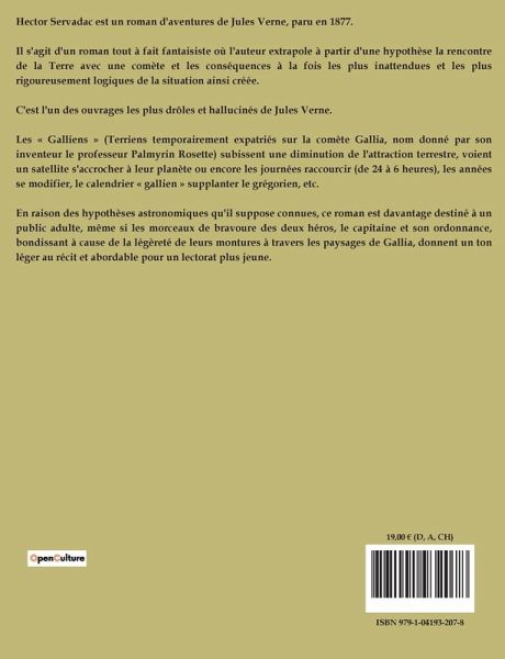"Hector Servadac" est un roman de Jules Verne qui entraîne le lecteur dans une aventure extraordinaire à travers l'espace. L'histoire débute avec le capitaine Hector Servadac, un officier de l'armée française stationné en Algérie, et son fidèle ordonnance, Ben-Zouf. Un événement cosmique inattendu propulse Servadac et d'autres personnages sur une trajectoire interplanétaire à bord d'un fragment de la Terre devenu un astéroïde nommé Gallia. Au fil de leur périple, ils rencontrent divers personnages, dont le professeur Palmyrin Rosette, un astronome excentrique qui révèle la nature de leur situation. Les voyageurs doivent s'adapter à leur nouvel environnement, faire face à des défis scientifiques et sociaux, et tenter de comprendre les lois physiques qui régissent leur nouvelle existence. Le roman explore des thèmes tels que l'ingéniosité humaine, la coopération internationale, et la curiosité scientifique. À travers des péripéties changeantes, Verne mêle science et fiction pour offrir une réflexion sur la place de l'humanité dans l'univers. L'uvre se termine par une tentative audacieuse de retour sur Terre, mettant en lumière l'évolution et l'esprit d'aventure des protagonistes.