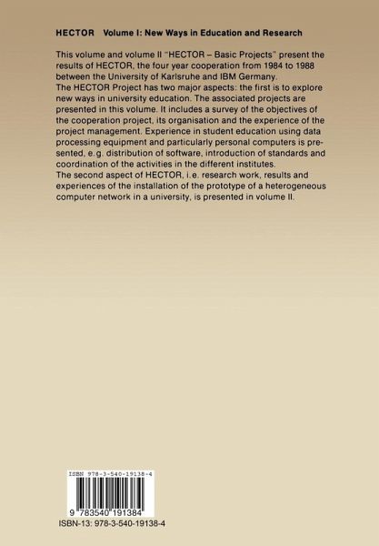 This volume and volume II HECTOR - Basic Projects present the results of HECTOR, the four-year cooperation from 1984-1988 between the University of Karlsruhe and IBM Germany. The HECTOR Project has two major aspects: the first is to explore new ways in university education. The associated projects are presented in this volume. It includes a survey of the objectives of the cooperation project, its organization and the experience of the project management. Experience in student education using data processing equipment and particularly personnel computers is presented, e.g. distribution of software, introduction of standards and coordination of the activities in the different institutes. The second aspect of HECTOR, i.e. research work, results and experiences of the installation of the prototype of a heterogeneous computer network in a university, is presented in volume II.