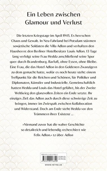 Die letzten Kriegstage in Deutschland. Es herrschen Chaos und Gewalt. In Neu Fahrland bei Potsdam stürmen sowjetische Soldaten die Villa Adlon und verhaften den Hausherrn: den Berliner Hotelbesitzer Louis Adlon. 13 Tage lang verfolgt seine Frau Hedda seine Spur quer durch Brandenburg. Barfuß, ohne Essen, ohne Bleibe. Eine Frau, die das Hotel Adlon in den Goldenen Zwanzigern zu dem machte, wofür es noch heute steht: Einem Treffpunkt für die Reichen und Schönen, für Politiker und Diplomaten, Künstler und Industrielle. Louis Adlon war ihre große Liebe, sie seine zweite Frau - für Louis' Familie blieb Hedda lange das "Miststück", das sich in die Familie eingeschlichen hatte. Gemeinschaftlich führten sie das Hotel, bis der Zweite Weltkrieg den glanzvollen Zeiten ein Ende setzte. Das einzige Ziel: das Adlon auch durch diese schwierige Zeit zu bringen, immer im Zwiespalt zwischen Kollaboration und Widerstand. Sie hielten den Hotelbetrieb so lange wie möglich aufrecht - doch am Ende steht Hedda vor den Trümmern ihrer Existenz ...