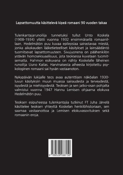 Lapsettomuusaiheinen koskettava romaani 90 vuoden takaa. Tulenkantajarunoilijana tunnetuksi tullut Unto Koskela (1908-1934) julkaisi vuonna 1932 romaanin, joka kuvaa epilepsiaa sairastavaa miestä, jonka aikakauden tieteellinen tieto ja lait tuomitsevat lapsettomuuteen. Sivujuonena on ajankohdan huomioiden rohkea homoseksuaalisuuden kuvaus hahmon kautta, jonka esikuvaksi on koettu runoilija Uuno Kailas. Harvinaisesta aiheesta kirjoitettu psykologinen romaani otettiin positiivisesti vastaan. Nykyhetken lukijalle teos antaa autenttisen kuvan 1930-luvun ajattelutavoista liittyen muun muassa sairauteen ja terveyteen, isyyteen ja miehisyyteen. Teoksen ja sen jatko-osan pohjalta valmistui vuonna 1947 Hannu Lemisen ohjaama elokuva.