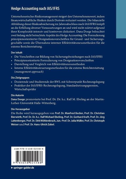 Unternehmerisches Risikomanagement stellt einen Beitrag zur Steigerungdes Unternehmenswertes dar, indem ungewollte finanzwirtschaftliche Risiken durch Derivate reduziert werden. Die entsprechende bilanzielle Abbildung der erreichten Risikoabsicherung im Jahresabschluss nach IAS/IFRS knüpft an die Erfüllung diverser Voraussetzungen und ist nicht zuletzt aufgrund ihrer Komplexität Gegenstand intensiver und kontrovers geführter Diskussionen in Wissenschaft und Praxis. Dana Doege beleuchtet zwei bislang noch nicht betrachtete Aspekte des Hedge Accounting. Diese umfassen zum einen die Formulierung prinzipienorientierter Designationsvorschriften für Grund- undSicherungsgeschäfte. Zum anderen wird in Bezug auf den Effektivitätsnachweis für Sicherungsbeziehungen ein Abbildungsvorschlag erarbeitet, der eine unternehmensübergreifende Vergleichbarkeit der Risikoabsicherung ermöglicht.