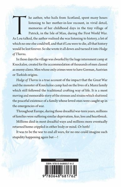 The author, who hails from Scotland, spent many hours listening to her mother-in-law recount, in vivid detail, memories of her childhood days in the tiny village of Patrick, in the Isle of Man, during the First World War. As Lou talked, the author realised she was listening to history, a lot of which no one else could tell, and that if Lou were to die, all that history would be lost forever. So she wrote it all down and turned it into Hedge of Thorns. In those days the village was dwarfed by the huge internment camp at Knockaloe, created for the accommodation of thousands of men classed as enemy aliens. Men whose only crimes were to have German, Austrian or Turkish origins. Hedge of Thorns is a true account of the impact that the Great War and the monster of Knockaloe camp had on the lives of a Manx family which still followed the traditional crofting way of life. It is a most moving and memorable story of the stresses and strains which shattered the peaceful existence of a family whose loved ones were caught up in the emergencies of war. Throughout Europe, during those dreadful war-torn years, millions of families were suffering similar deprivation, fear, loss and heartbreak. Millions died in most dreadful ways and millions more eventually returned home crippled in either body or mind. Or both! It was to be the war to end all wars, for no one could imagine such stupidity happening again but-!