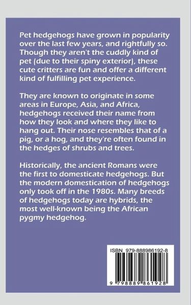 Pet hedgehogs have grown in popularity over the last few years, and rightfully so. Though they aren't the cuddly kind of pet (due to their spiny exterior), these cute critters are fun and offer a different kind of fulfilling pet experience. They are known to originate in some areas in Europe, Asia, and Africa, hedgehogs received their name from how they look and where they like to hang out. Their nose resembles that of a pig, or a hog, and they're often found in the hedges of shrubs and trees. Historically, the ancient Romans were the first to domesticate hedgehogs. But the modern domestication of hedgehogs only took off in the 1980s. Many breeds of hedgehogs today are hybrids, the most well-known being the African pygmy hedgehog. This book will show you how to keep up with the animal's high exercise demands, and how to assess and work with your individual hedgehog's unique personality. You'll learn which toys and treats they especially love, what things to avoid, and how to co-ordinate a nocturnal animal's ideal schedule with your day to day activities. In this guide you will also learn how to feed, care, grooming, Handling, Health Needs, housing, safety and security tips and guide on how to raise hedgehogs as pets. GET YOUR COPY NOW