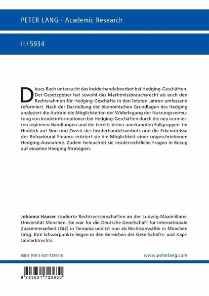 Dieses Buch untersucht das Insiderhandelsverbot bei Hedging-Geschäften. Der Gesetzgeber hat sowohl das Marktmissbrauchsrecht als auch den Rechtsrahmen für Hedging-Geschäfte in den letzten Jahren umfassend reformiert. Nach der Darstellung der ökonomischen Grundlagen des Hedging analysiert die Autorin die Möglichkeiten der Widerlegung der Nutzungsvermutung von Insiderinformationen bei Hedging-Geschäften durch die neu normierten legitimen Handlungen und die bereits bisher anerkannten Fallgruppen. Im Hinblick auf Sinn und Zweck des Insiderhandelsverbots und die Erkenntnisse der Behavioural Finance erörtert sie die Möglichkeit einer ungeschriebenen Hedging-Ausnahme. Zudem beleuchtet sie insiderrechtliche Fragen in Bezug auf einzelne Hedging-Strategien.