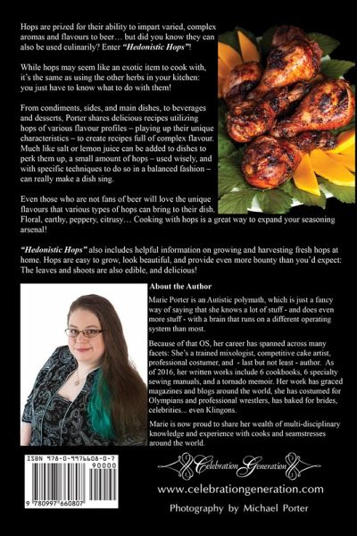 Hops are prized for their ability to impart varied, complex flavours to beer... but did you know they can also be used culinarily? As a recipe developer / cookbook author married to an enthusiastic hophead, Marie Porter has created many amazing recipes featuring the bitter flower. These recipes have been wildly popular not only with her friends and family, but on her food & lifestyle blog, Celebration Generation. Now, she has developed an entire cookbook of hop recipes - the first of its kind! While hops may seem like a bizarre or exotic item to cook with, it's the same as using other herbs and spices in your kitchen... you just have to know what to do with them! From condiments, sides, and main dishes, to beverages and desserts, Porter shares delicious recipes utilizing hops of various flavour profiles - playing up their unique characteristics - to create recipes full of complex flavour. . Much like salt or lemon juice can be added to dishes to perk them up, a small amount of hops - used wisely, and with specific techniques to do so in a balanced fashion - can really make a dish sing. Even those who are not fans of beer will love the unique flavours that various types of hops can bring to their plate. Floral, earthy, peppery, citrusy... Cooking with hops is a great way to expand your seasoning arsenal! "Hedonistic Hops" includes helpful information on growing and harvesting fresh hops at home. Hops are easy to grow, look beautiful, and provide even more bounty than you'd expect: The leaves and shoots are also edible, and delicious! Hedonistic Hops includes recipes for using not only the cone/flower of the hop plant, but also the leaves and shoots. Spoiler: Hop leaves taste even better than grape leaves! In addition to home grown hops,"Hedonistic Hops" contains straight forward information on how to obtain and use the various forms of commercially available hops - Fresh, dried, and pellet. Hedonistic Hops: The HopHead's Guide to Kitchen Badassery includes over 50 recipes, and feature gorgeous full colour photography for each recipe. Measurements are provided in both US and metric units.