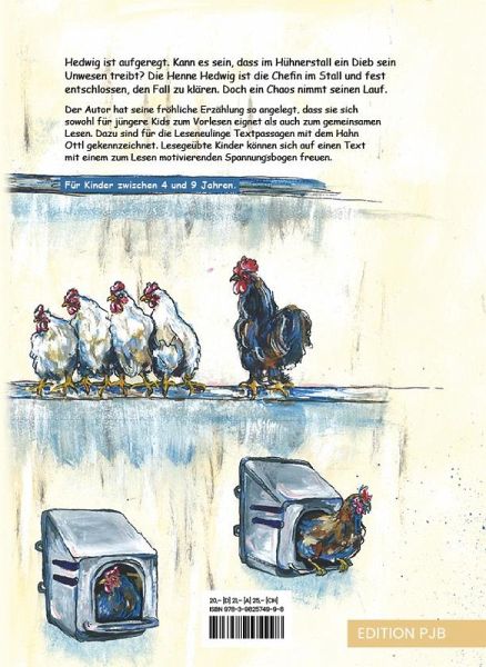 Hedwig ist aufgeregt. Kann es sein, dass im Hühnerstall ein Dieb sein Unwesen treibt? Die Henne Hedwig ist die Chefin im Stall und fest entschlossen, den Fall zu klären. Doch ein Chaos nimmt seinen Lauf. Der Autor Ralf M. Ruthardt hat seine fröhliche Erzählung so angelegt, dass sie sich sowohl für jüngere Kids zum Vorlesen eignet als auch zum gemeinsamen Lesen. Dazu sind für die Leseneulinge Textpassagen mit dem Hahn Ottl gekennzeichnet. Lesegeübte Kinder können sich auf einen Text mit einem zum Lesen motivierenden Spannungsbogen freuen. Die Geschichte ist wunderschön illustriert mit Hühner-Gemälden der Künstlerin Saskia Thurner.