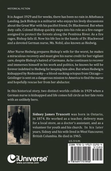 It is August 1929 and for weeks, there has been no rain in Athebasca Landing. Jack Bishop is a militarist who enjoys his lively discussions about the Great War with his pacifist friend, Dr. Blackwood. But when duty calls, Colonel Bishop quickly steps into his role as a fire-ranger assigned to protect the forests along the Pembina River. As a fire rages, Bishop falls ill. Now his life lies in the hands of Dr. Blackwood and a devoted German nurse, Ms. Nobil, also known as Hedwig. After Nurse Hedwig prepares Bishop's wife for the worst, he makes a miraculous recovery and must give his nurse credit for her vigilant care, despite Bishop's hatred of Germans. As he continues to recover and immerses himself in his work and politics, he knows he will be forever indebted to Hedwig for keeping him alive. But when Hedwig is kidnapped by Rodnunsky-a blood-sucking octopus from Chicago-Geislinger is sent on a dangerous mission to America to find the nurse and hopefully rescue her from her abductor. In this historical story, two distinct worlds collide in 1929 when a German nurse is kidnapped and life comes full circle as her fate rests with an unlikely hero.