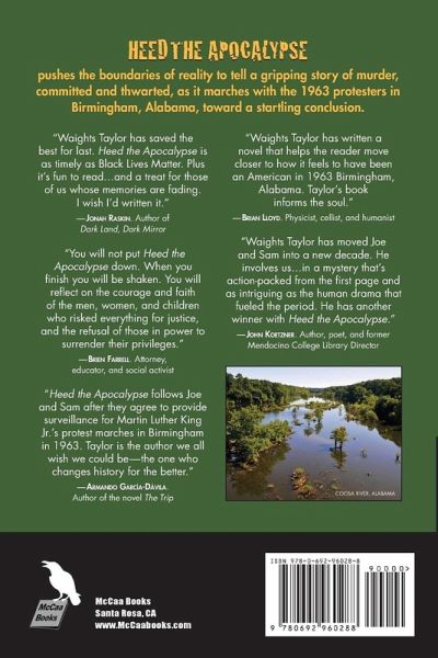 Heed the Apocalypse pushes the boundaries of reality to tell a gripping story of murder, committed and thwarted, as it marches with Martin Luther King Jr. and the 1963 protesters in Birmingham, Alabama, toward a startling conclusion. What if the events at the Sixteenth Street Baptist Church in Birmingham, Alabama, in the early morning hours of September 15, 1963, had turned out differently? "Waights Taylor has saved the best for last. Heed the Apocalypse is as timely as Black Lives Matter. Plus it’s fun to read…and a treat for those of us whose memories are fading. I wish I’d written it."—Jonah Raskin. Author of Dark Land, Dark Mirror "You will not put Heed the Apocalypse down. When you finish you will be shaken. You will reflect on the courage and faith of the men, women, and children who risked everything for justice, and the refusal of those in power to surrender their privileges."—Brien Farrell. Attorney, educator, and social activist "Waights Taylor has written a novel that helps the reader move closer to how it feels to have been an American in 1963 Birmingham, Alabama. Taylor’s book informs the soul."—Brian Lloyd. Physicist, cellist, and humanist "Waights Taylor has moved Joe and Sam into a new decade. He involves us…in a mystery that’s action-packed from the first page and as intriguing as the human drama that fueled the period. He has another winner with Heed the Apocalypse."—John Koetzner. Author, poet, and former Mendocino College Library Director